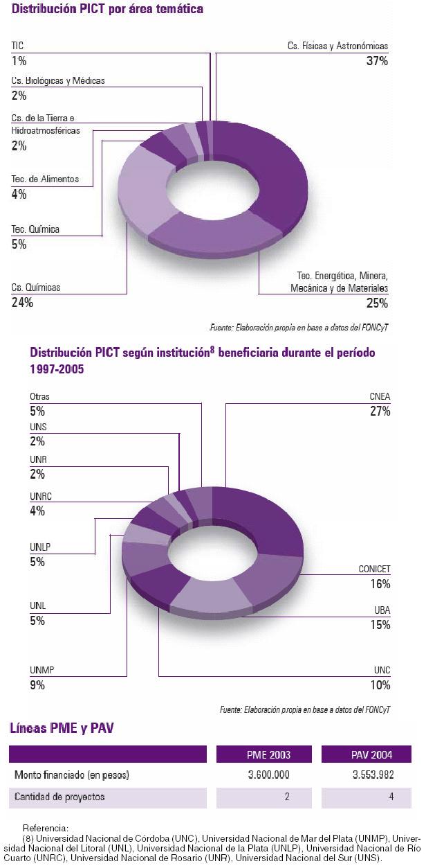 Durante el período 1997-2006, el Fondo para la Investigación Científica y Tecnológica (FONCyT) financió 103 proyectos orientados al sector de nanotecnología a través de las siguientes convocatorias: